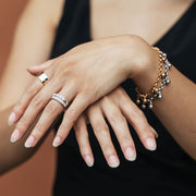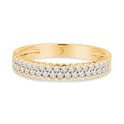 The Honeycomb Band brings a touch of golden sweetness to any stack. Two shimmering rows of diamonds are wrapped in a sleek, high-polish setting that catches the light with every move. Wear it solo or pair it with other bands to create a richer, wider look. Chic, versatile, and endlessly charming, it’s a piece that instantly sweetens your collection.