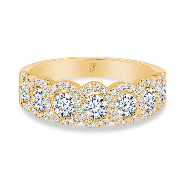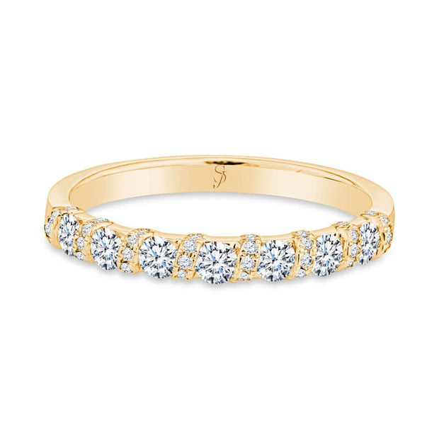 Regular price $1,990.00 Save $-1,990.00The Blossom Band is designed to shine from every angle, with diamonds set on all three sides in delicate micro-pavé. Minimal gold and precision-placed melee stones create a continuous bloom of sparkle that beautifully enhances each diamond. Perfect alongside a solitaire engagement ring or stunning worn solo, it’s a radiant, refined choice for any bridal stack.
