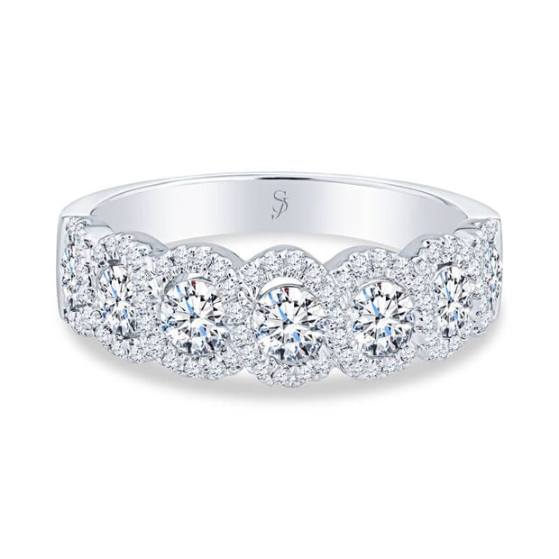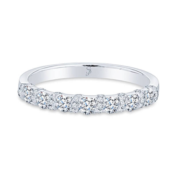 Regular price $1,590.00 Save $-1,590.00This band has beautiful characters. Melee diamonds weave in and out of each diamond giving this overall ring a more romantic look. The extension of the melee diamonds embraces the each side of the ring, giving more dimension to the ring.