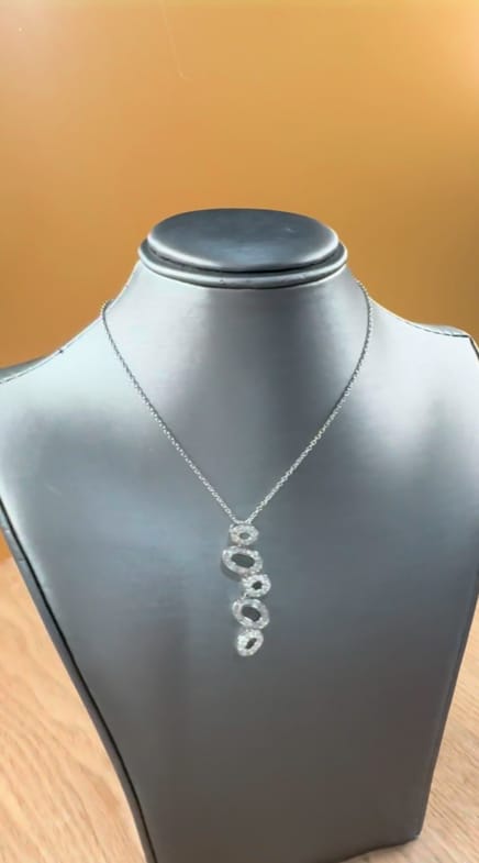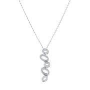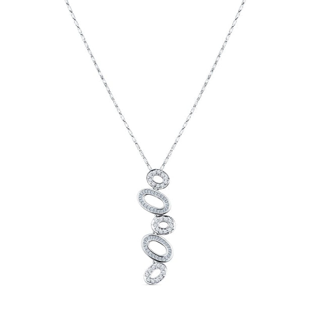 Regular price $1,590.00 Save $-1,590.00A decadent row of free-falling oval and round open halo bubbles filled with sparkling diamonds gives this handcrafted 18K white gold linear pendant unique abstract artistry with smooth lines. Perfect for pairing with a chain of your selection or layered with other necklaces for a highly accessorized style customized for you. Alternates between round diamonds on one circle and the next one is baguette diamonds.