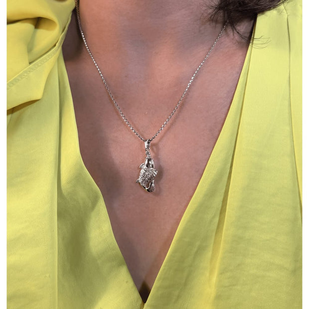 Regular price $1,935.00 Save $-1,935.00This imaginative 18K white gold diamond heart pendant exudes a romantic elegance with artistic attention to unique design details. Glittering round brilliant cut diamonds placed in an open halo encompass triple moving dangle clusters of additional diamonds nestled inside. Hearts symbolize love and affection, perfect as a bespoke gift to any loved one.