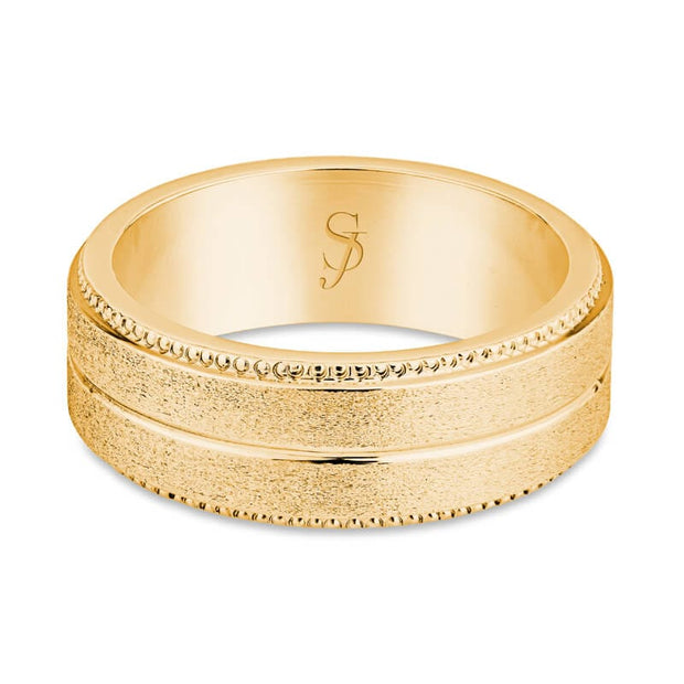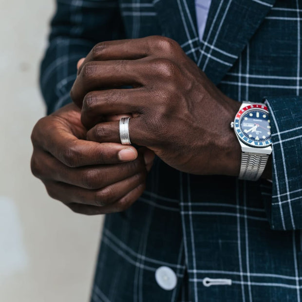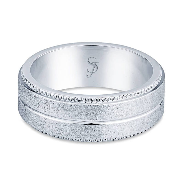 The Kuat Band is a study in modern strength. Its smooth sandblasted finish is paired with crisp milgrain edges and sleek high-polish lines, creating a refined contrast that feels both bold and sophisticated. With its clean structure and powerful presence, this band delivers a contemporary statement that stands out with quiet luxury.